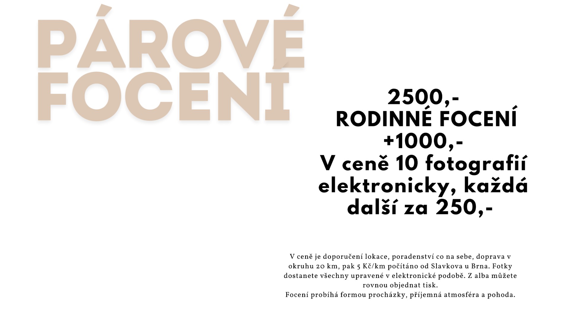 Nejčastěji využíváná služba. Focení je nestrojené, snažím se zachytit to nejlepší z vás. Nervozita po chvíli opadne a vy si focení užijete - to slibuji.