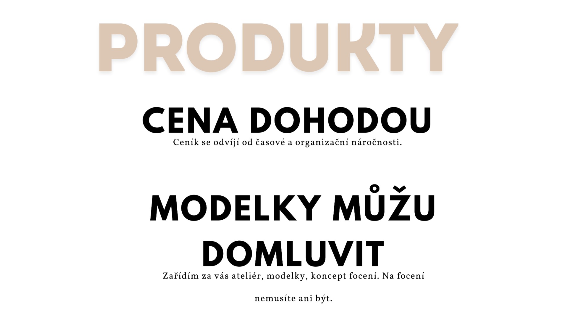 Ať už jde o produkty, lidi, kombinace produktů s modelkami. V tomto jsem se pohybovala v rámci spolupráce s jednou skvělou firmou a díky tomu mám přehled. Seženu vám ateliér, modelky, namyslím celý koncept. Prostě bez starostí a klidně i bez vaší přítomnosti.